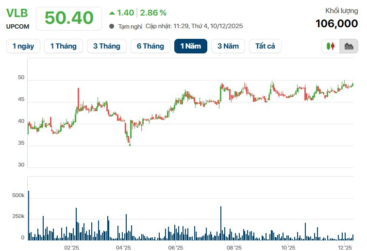 Kết thúc phiên giao dịch buổi sáng ngày 10/12, cổ phiếu VLB đã tăng 2,86% lên mức giá 50.400 đồng/cp. Tính từ đầu năm đến nay, cổ phiếu VLB đã tăng khoảng 27%.