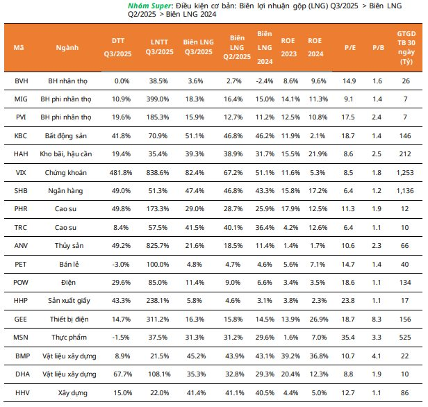 Mirae Asset lọc ra 18 cổ phiếu nhóm "Super" - "siêu cổ phiếu" với điều kiện cơ bản là biên lợi nhuận gộp quý 3/2025 lớn hơn biên LNG quý 2/2025 và cùng lớn hơn biên LNG năm 2024. Trong đó, có thể kể tới là các doanh nghiệp thuộc nhóm bảo hiểm (BVH, MIG, PVI), bất động sản (KBC); chứng khoán VIX và Ngân hàng SHB,...