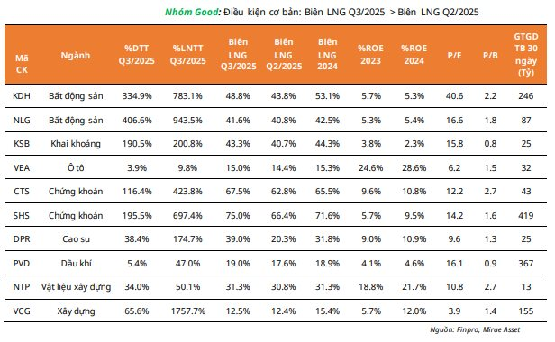 Ngoài ra, đội ngũ phân tích cũng đưa ra danh sách 10 cổ phiếu "Good" - tốt với điều kiện cơ bản là biên lợi nhuận gộp quý 3/2025 lớn hơn biên LNG quý 2/2025, gồm KDH, NLG, KSB, VEA, CTS, SHS,…