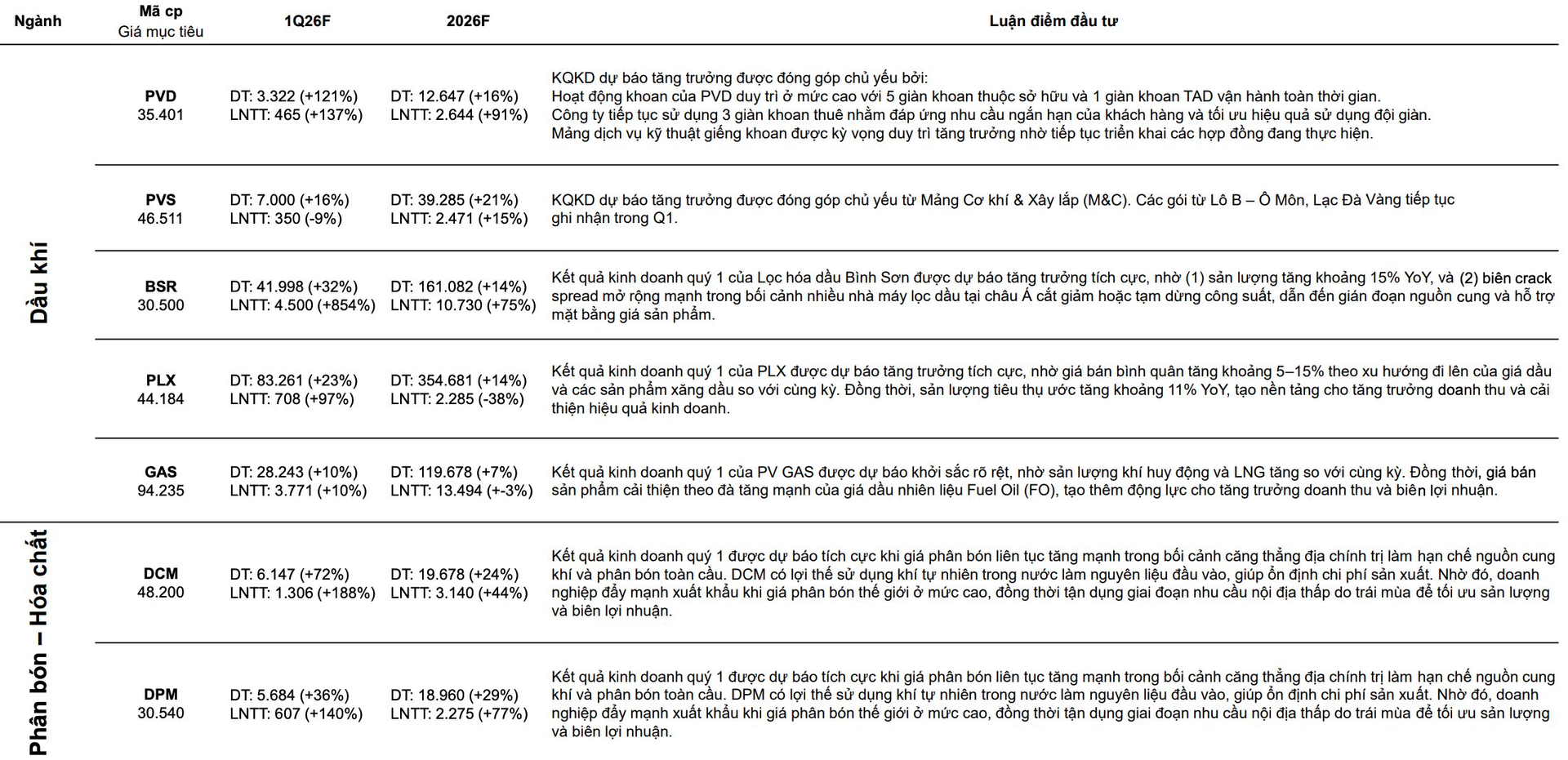 Trong bối cảnh đó, một số doanh nghiệp như PLX, GAS được đánh giá có khả năng ghi nhận lợi nhuận trước thuế quý 1/2026 tăng trưởng 2 chữ số, đạt lần lượt 708 tỷ (+97%) và 3.771 tỷ đồng (+10%).