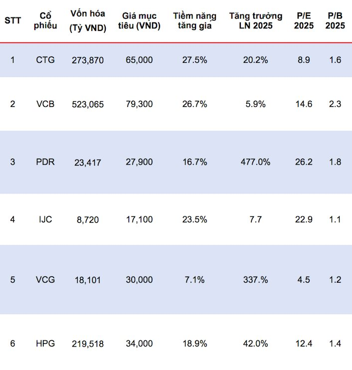 Trong bối cảnh môi trường lãi suất thấp, giải ngân đầu tư công tăng tốc về cuối năm và khung pháp lý ngành năng lượng đang trở nên hoàn thiện, bộ phận phân tích MBS cho rằng cơ hội đầu tư sẽ tập trung ở nhóm ngân hàng, đầu tư công, bất động sản và năng lượng. Danh mục các cổ phiếu tiêu biểu MBS lựa chọn cho tháng 10/2025 bao gồm: VCB, CTG, PDR, IJC, VCG, HPG, HDG, PVD, MSN, ANV.