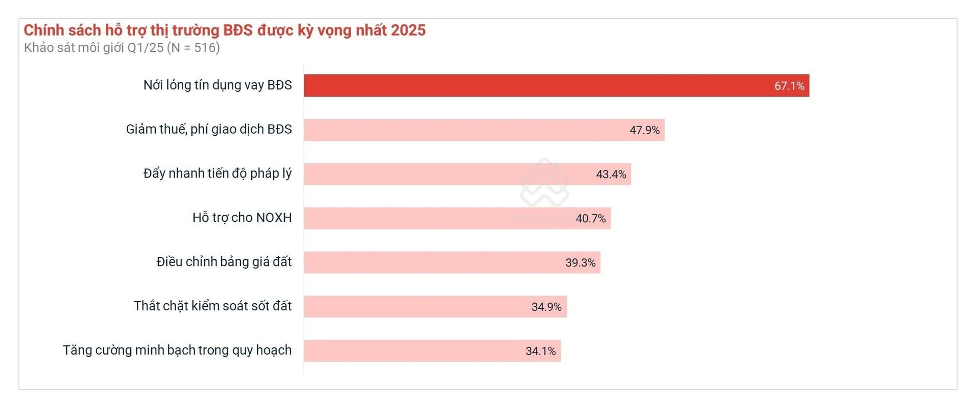 Trả lời khảo sát quý 1/2025 của Batdongsan.com.vn, có 67,1% môi giới kỳ vọng chính sách “Nới lỏng tín dụng vay mua bất động sản”, 47,9% môi giới kỳ vọng “Giảm thuế, phí giao dịch bất động sản”, 43,4% môi giới kỳ vọng “Đẩy nhanh tiến độ pháp lý”.