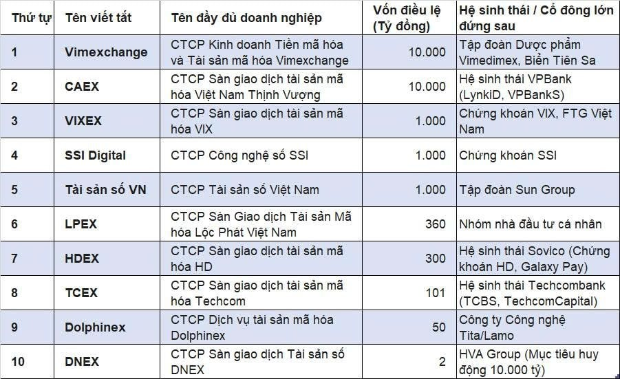Tiếp sau là Công ty CP Sàn giao dịch tài sản mã hóa Techcom (TCEX) thuộc hệ sinh thái Techcombank với vốn điều lệ 101 tỷ đồng và Công ty CP Dịch vụ tài sản mã hóa Dolphinex duy trì ở mức 50 tỷ đồng.