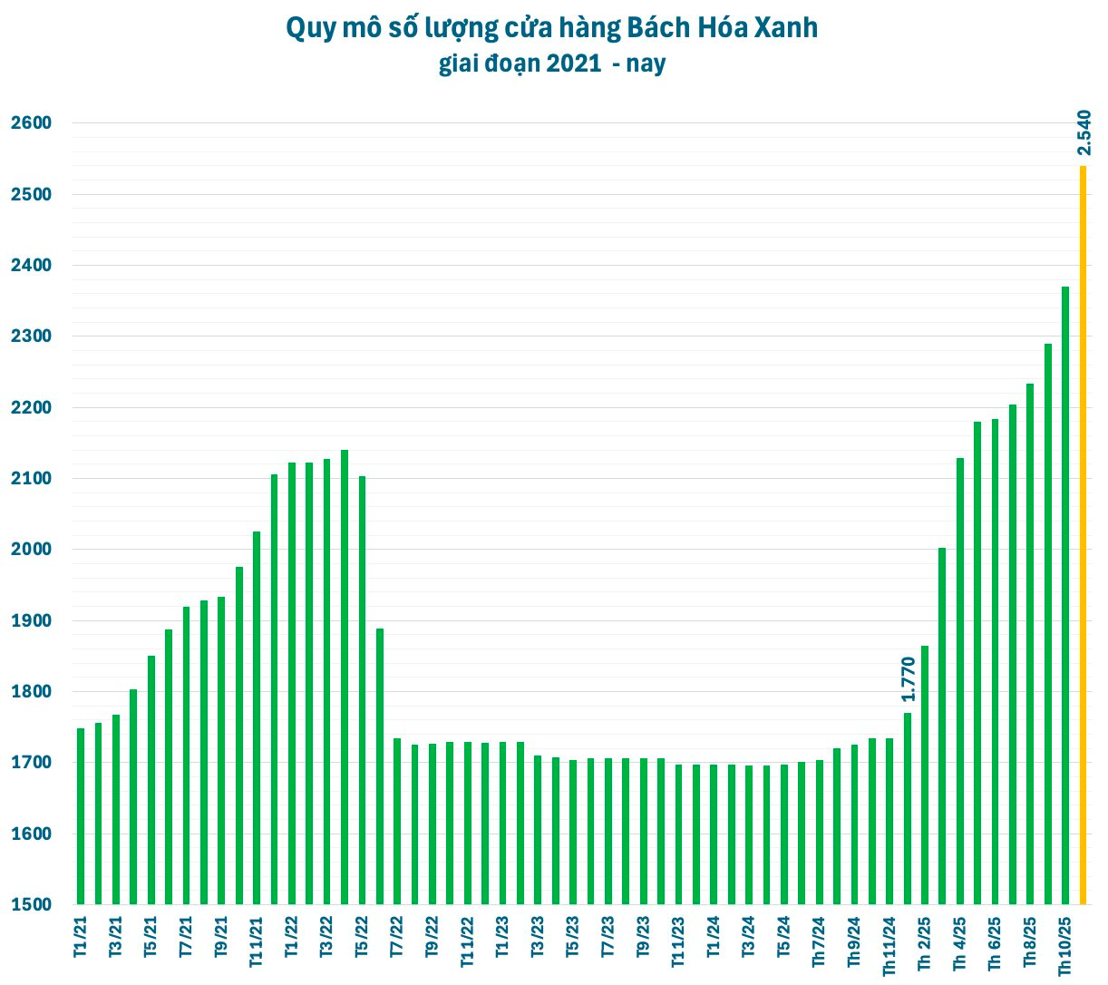 Sau 11 tháng, BHX đã mở thêm 721 cửa hàng, vượt kế hoạch đề ra là mở mới 600 cửa hàng trong 2025, với gần 50% tại khu vực miền Trung. Các cửa hàng mới ghi nhận tổng lợi nhuận dương ở cấp độ cửa hàng. Đáng chú ý, BHX đãchính thức ra mắt tại miền Bắc với 20 siêu thị đầu tiên tại Ninh Bình trong tháng 11. Theo cập nhật trên website bán hàng tính đến cuối ngày 22/12, BHX có 2.540 cửa hàng, tức mở thêm 58 điểm bán từ đầu tháng 12.