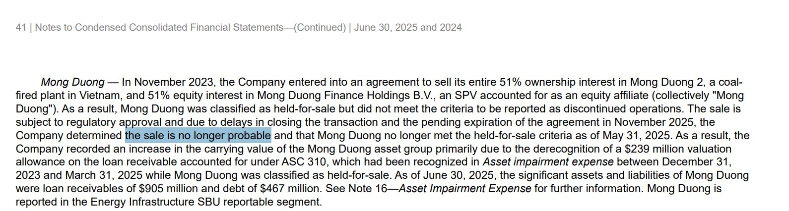Nhà máy Mông Dương 2 được phân loại lại trong báo cáo tài chính của AES thành nhóm "nắm giữ và sử dụng" (held and used), thay vì trước đó ở nhóm "tài sản chờ bán" (held-for-sale).