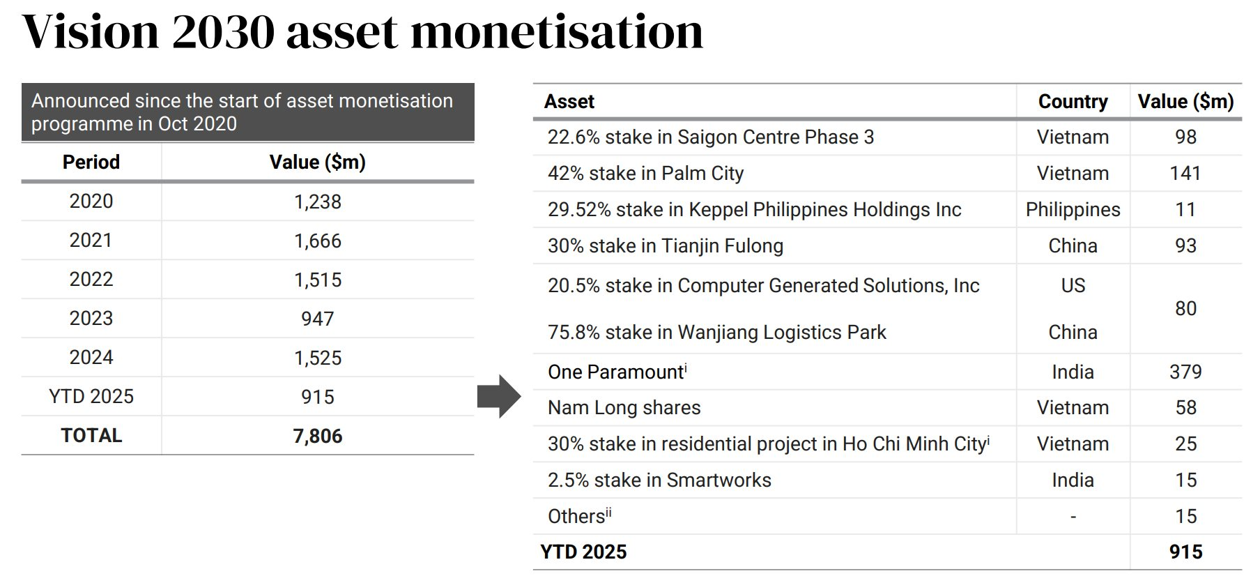 Báo cáo tổng kết quý 2/2025 của Keppel cho thấy doanh nghiệp đã bán vốn nhiều dự án ở Việt Nam, Ấn Độ, Trung Quốc, Philippines tính đến hết tháng 7 năm nay, kiếm về 915 triệu SGD.