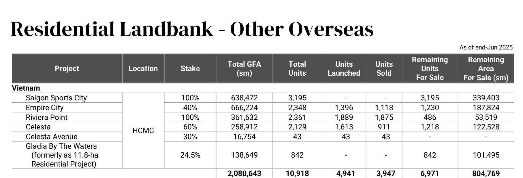 Tính đến hết tháng 6/2025, Keppel đang có quỹ đất khoảng 2,1 triệu m2 ở Việt Nam. Phần đất này tương ứng 10.918 đơn vị nhà, trong đó 3.947 đã bán và 6.971 đang chờ bán.