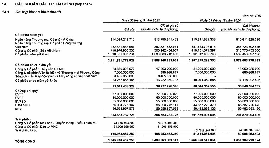 Khoản lỗ lớn nhất trong danh mục này đến từ VNM; giá gốc khoản đầu tư vào VNM là 418,9 tỷ đồng, nhưng giá trị ghi sổ chỉ còn 305,9 tỷ đồng, tương đương mức trích lập dự phòng 113 tỷ đồng (chiếm 77% tổng dự phòng). Dù vậy, tổng dự phòng của danh mục (147,2 tỷ đồng) đã giảm đáng kể so với mức 202,9 tỷ đồng hồi đầu năm, cho thấy giá trị danh mục đã có sự cải thiện.