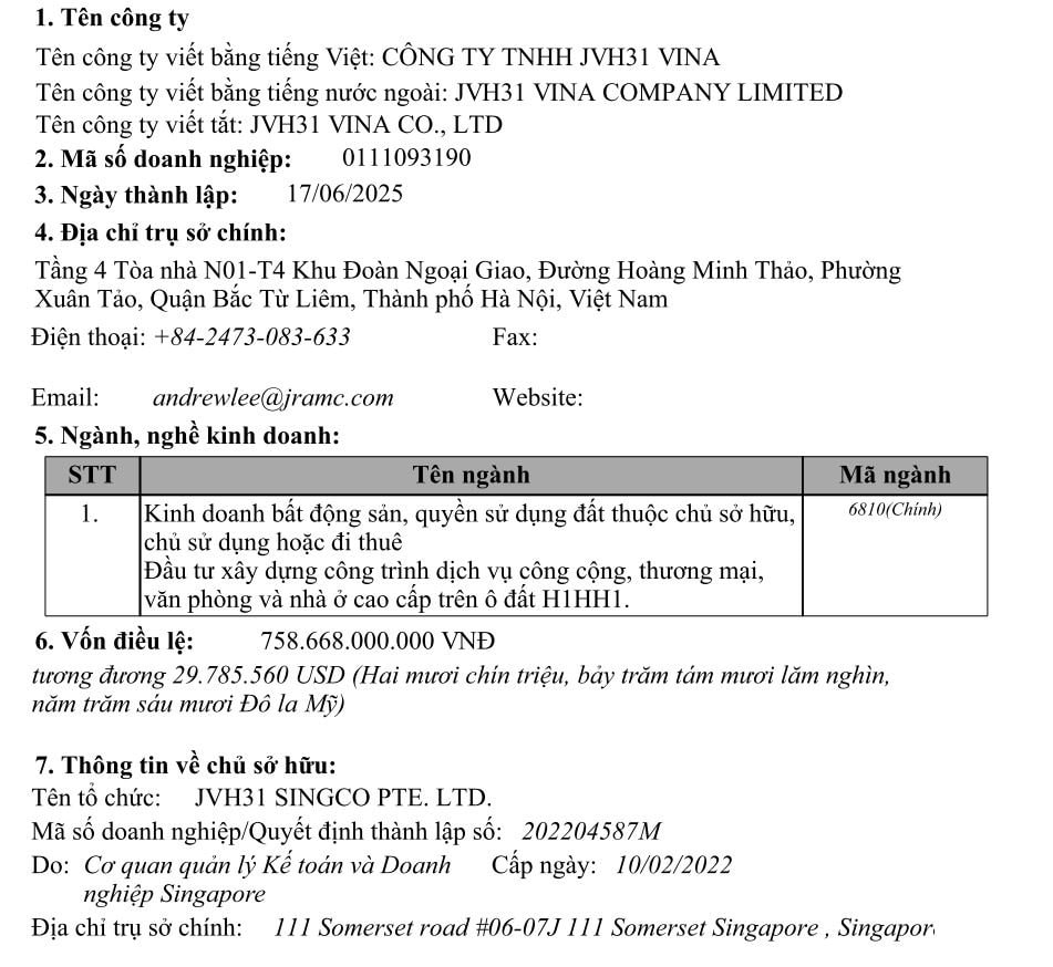 Về danh tính doanh nghiệp vừa được giao gần 1,5 ha đất “vàng” tại Tây Hồ Tây, theo dữ liệu đăng ký doanh nghiệp, Công ty TNHH JVH31 Vina được thành lập ngày 17/6/2025, trụ sở đặt tại phường Xuân Đỉnh, quận Bắc Từ Liêm (Hà Nội) cùng địa bàn với dự án được giao.