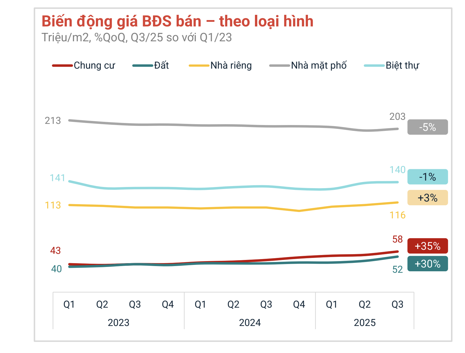Dữ liệu quý 3/2025 từ Batdongsan.com.vn chỉ ra, mức độ biến động tăng giá của phân khúc đất nền chỉ đứng sau chung cư. So với quý 1/2023, giá đất nền TP.Hồ Chí Minh đã tăng 30%, trong khi mức độ tăng giá của chung cư là 35%. Theo đơn vị này, đây là hai phân khúc tăng giá tốt nhất trong suốt 2 năm qua.
