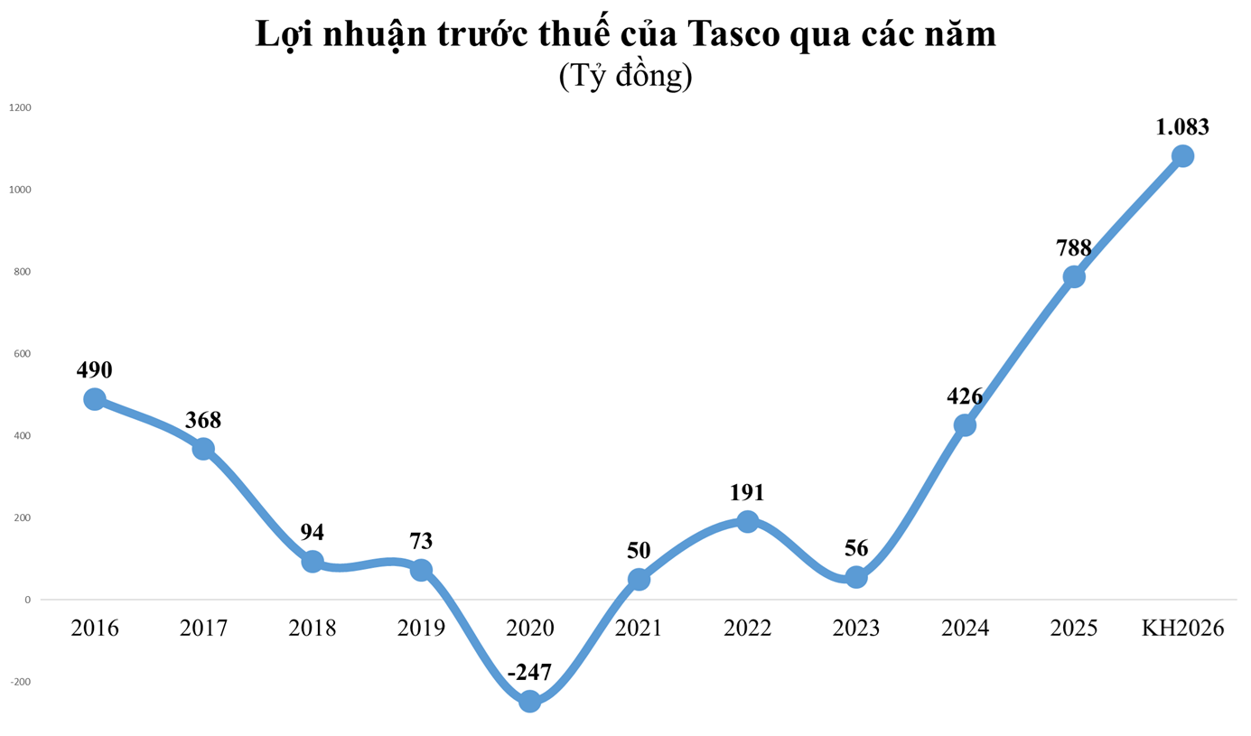 Sang năm 2026, Tasco đặt mục tiêu đạt doanh thu kỷ lục gần 55.000 tỷ đồng, tăng 51% so với năm 2025. Lợi nhuận trước thuế dự kiến đạt 1.083 tỷ đồng, tương ứng mức tăng 37,5% và cũng là mức cao nhất trong lịch sử hoạt động của doanh nghiệp nếu hoàn thành.