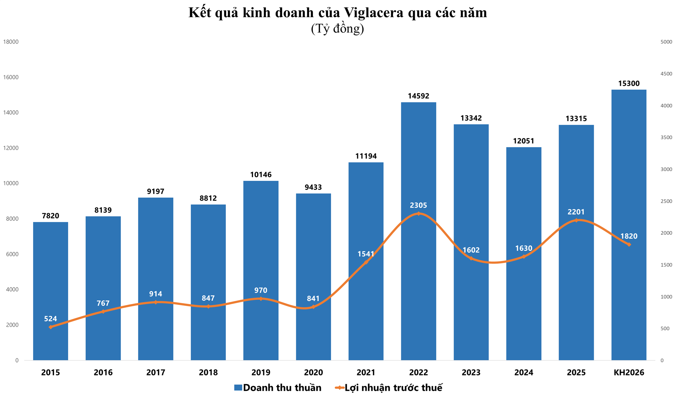 Sang năm 2026, Viglacera đặt mục tiêu đạt tổng doanh thu hợp nhất cao kỷ lục với 15.300 tỷ đồng, tăng trưởng 15% so với năm 2025. Tuy nhiên, lợi nhuận trước thuế hợp nhất dự kiến giảm 17% so với năm trước, đạt 1.820 tỷ đồng. Tỷ lệ chia cổ tức dự kiến là 10% bằng tiền mặt.