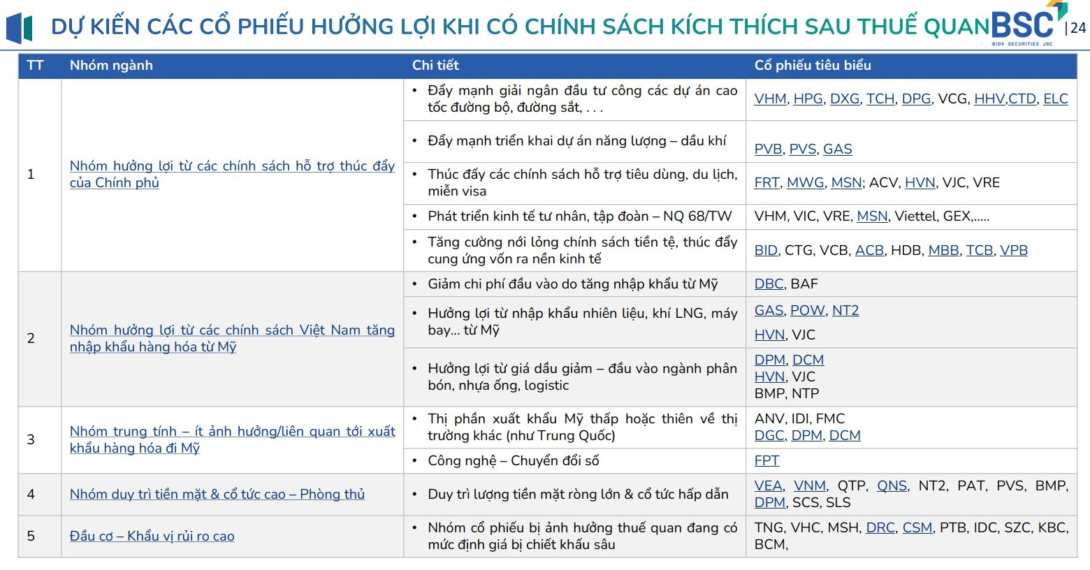 Đối với những nhà đầu tư có khẩu vị rủi ro cao, BSC chỉ ra nhóm cổ phiếu bị ảnh hưởng thuế quan đang có mức định giá bị chiết khấu sâu bao gồm TNG, VHC, MSH, DRC, CSM, PTB, IDC, SZC, KBC, BCM,...