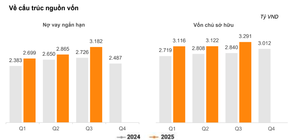 Đến cuối quý III, công ty có hơn 5.925 tỷ đồng nợ phải trả, tăng 8% so với đầu kỳ, trong đó, chiếm gần 54% là nợ vay ngắn hạn, tương đương 3.182 tỷ đồng, tăng 28% so với đầu năm. Vốn chủ sở hữu ở mức 3.291 tỷ đồng. Như vậy, tỷ lệ nợ vay trên vốn chủ sở hữu (D/E) được duy trì dưới mức 1 qua các quý (dao động từ 0,83 đến 0,97 lần).