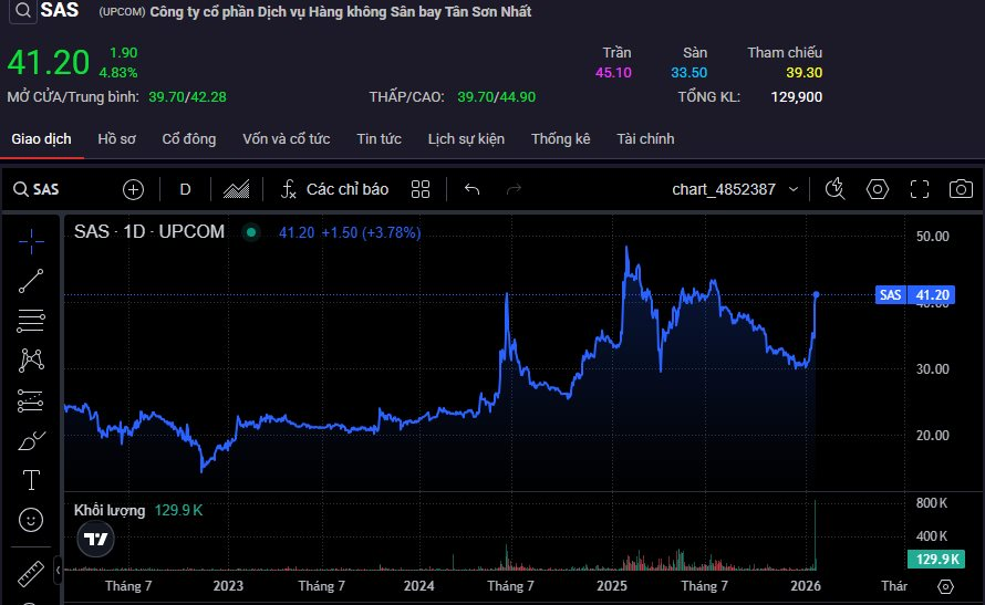 Trên thị trường, cổ phiếu SAS chốt phiên 22/1 với mức tăng 4% lên mốc 41.200 đồng/cp, tương đương vùng cao nhất trong vòng 6 tháng. Chỉ tính từ đầu năm 2026 tới nay, cổ phiếu này đã bật tăng hơn 30% giá trị.