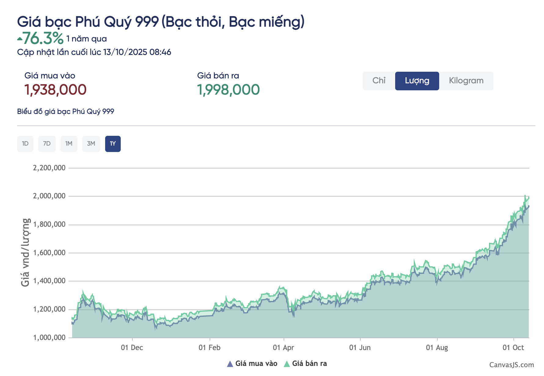 Theo niêm yết của Phú Quý 08:46, sáng thứ 2, ngày 13/10, 1 lượng bạc mua vào, bán ra lần lượt là 1.938 triệu đồng/lượng – 1.998 triệu đồng/lượng, tương ứng 1 kg bạc mua vào, bán ra lần lượt gần 51,679 triệu đồng/kg – hơn 53,279 triệu đồng/kg, tăng 30% trong 3 tháng qua và tăng 76% trong vòng 1 năm qua.