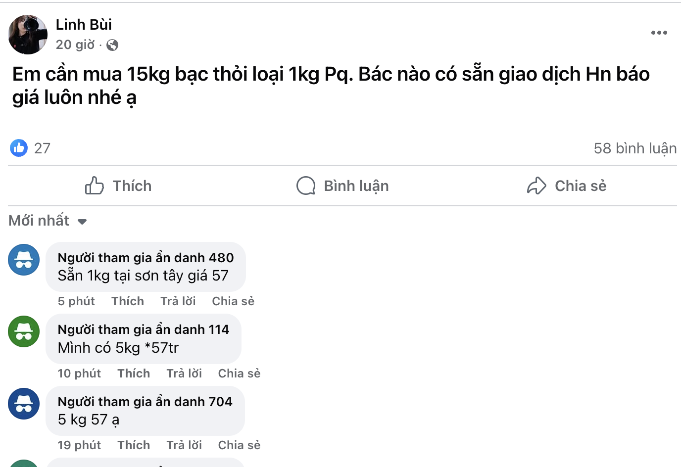 Anh Thành Công, một nhà đầu tư bạc tại Hà Nội cho biết, mặc dù muốn mua thêm bạc, nhưng giấy hẹn từ nhà sản xuất khá lâu khiến anh chần chừ, các giao dịch trực tiếp trên các hội nhóm trước kia là giá trung bình mua, bán chia 2 (giá web/2 – PV) nhưng hiện giờ giá thường chênh lên 1 triệu-2 triệu/kg bạc để giao, nhận bạc trực tiếp, thậm chí cao hơn.