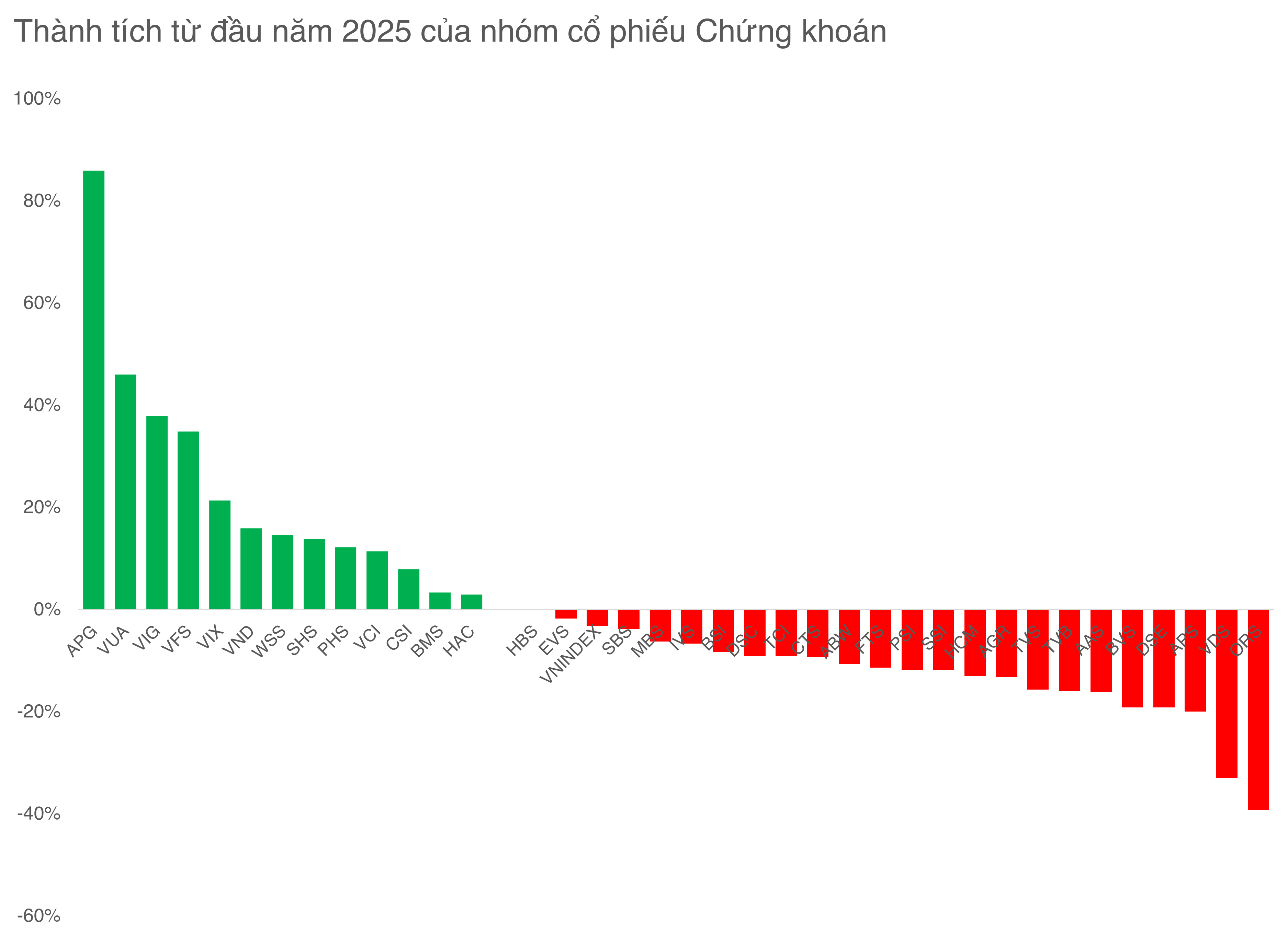 Ngược lại, các CTCK nhỏ lại nổi bật với mức tăng ấn tượng. APG tăng 85,9%, VUA tăng 46%, và VIG tăng 37,9%, phản ánh động thái mua gom từ các cổ đông lớn trong quá trình tái cơ cấu.