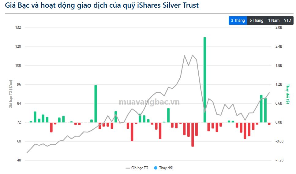 SLV bán ròng trở lại trong phiên giá bạc hồi phục 2,4% trên mức 89 USD/oz (sàn COMEX), cao nhất kể từ đầu tháng. Tuy nhiên, so với mức đỉnh trên 120 USD/oz hồi cuối tháng 1, giá bạc hiện thấp hơn khoảng 30%.