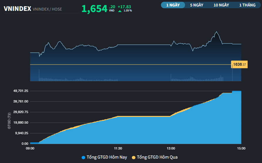 Cuối cùng là các cổ phiếu Bất động sản và Khu Công nghiệp cũng ghi dấu ấn với NDN, HAR, CII, DIG, KBC, HAR tăng trần. Tổng cộng, toàn HOSE ghi nhận hơn 50% mã tăng giá. Chỉ số VN-Index tăng 17,83 điểm lên 1.654,2 điểm (+1,09%). Tổng giá trị giao dịch sàn đạt gần 54.000 tỷ đồng.