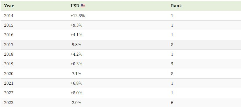 Đô la Mỹ là đồng tiền có hiệu suất tốt nhất trong giai đoạn 2014-2023, chiếm vị trí số 1 trong 6 năm. Kinh tế Mỹ tương đối ổn định và vai trò là đồng tiền dự trữ của thế giới đã củng cố sức mạnh của đồng bạc xanh.