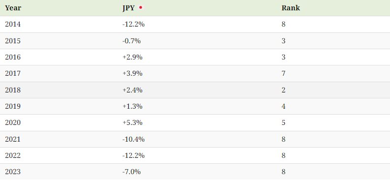 Yên Nhật là đồng tiền có hiệu suất thấp nhất trong số 8 loại tiền tệ trong 10 năm qua, đứng ở vị trí cuối cùng trong 4 năm.
