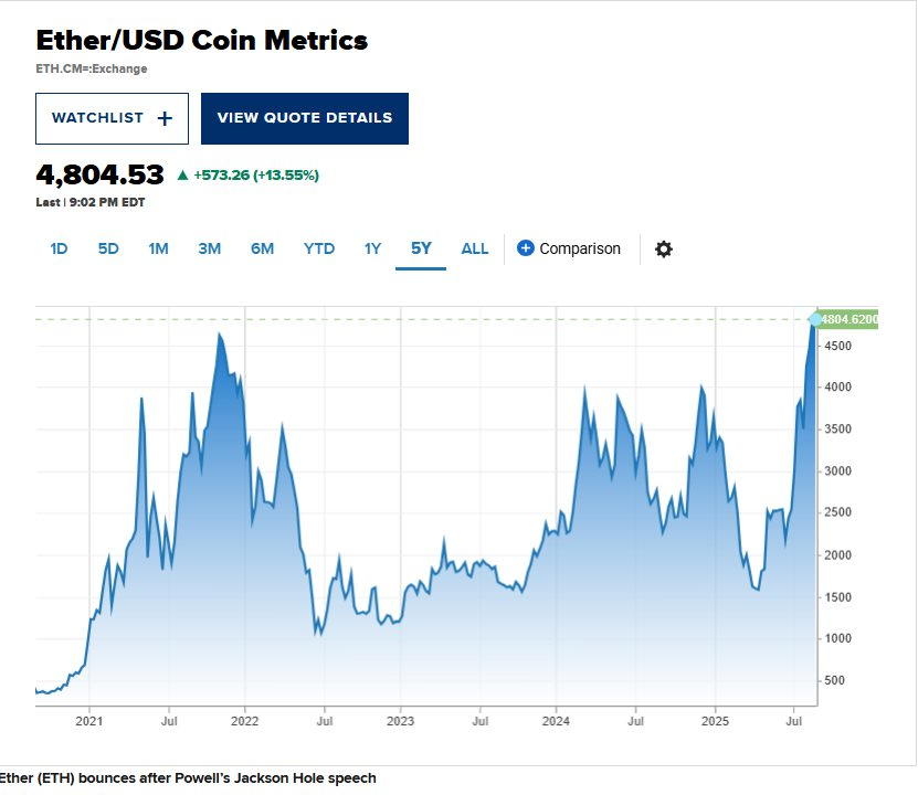 Đồng tiền số lớn thứ hai thế giới tăng vọt 15% cuối phiên, lên tới 4.885 USD, vượt qua kỷ lục cũ 4.866,01 USD thiết lập tháng 11/2021.