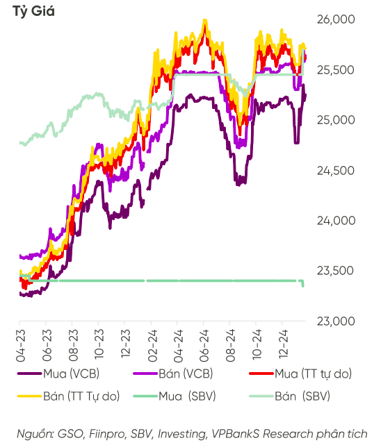 Đối với thị trường trong nước, tỷ giá có xu hướng tăng đột biến với mức giao dịch tại các ngân hàng thương mại đạt khoảng 25.200 - 25.600 VND/USD, buộc Ngân hàng Nhà nước (NHNN) phải can thiệp mạnh mẽ qua việc bán ngoại tệ giao ngay và triển khai hợp đồng kỳ hạn nhằm ổn định thị trường. Bên cạnh đó, NHNN đã chủ động nâng tỷ giá trung tâm vào ngày 10/1 lên 24.338 và ghi nhận tại ngày 24/2/2025 là 24.646.