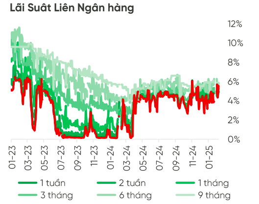 Liên quan đến lãi suất, trong giai đoạn đầu năm, lãi suất liên ngân hàng không quá biến động, dao động quanh mức 3,79% - 4,95% trong tháng 1/2025. Sự ổn định này phần nào đến từ các đợt can thiệp của NHNN qua các kênh OMO như tín phiếu và REPO, mặt bằng lãi suất liên ngân hàng được điều chỉnh cho phép duy trì mức ổn định trong hệ thống.