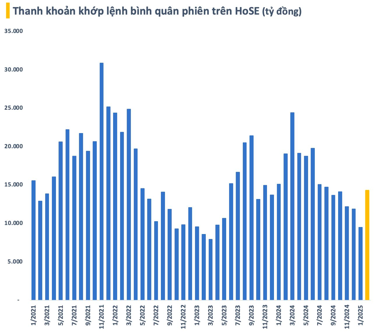 Đáng chú ý, tâm lý nhà đầu tư đang được cải thiện, dòng tiền quay trở lại mạnh mẽ và có sự lan toả giữa các nhóm ngành. Thanh khoản thị trường tăng vọt với giá trị khớp lệnh bình quân trên HoSE trong tháng 2 đạt hơn 14.000 tỷ/phiên, gấp rưỡi tháng đầu năm và là mức cao nhất kể từ tháng 8/2024.