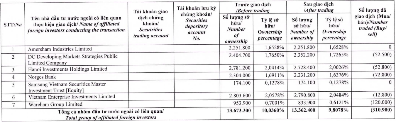 Theo đó, 5 quỹ thành viên thuộc Dragon Capital đã bán ta tổng cộng 310.900 cổ phiếu FRT. Cụ thể, quỹ thành viên DC Developing Markets Strategies Public Limited Company bán ra 52.500 cổ phiếu, quỹ Hanoi Investment Holdings Limited bán 52.800 cổ phiếu; quỹ Norges Bank bán 72.800 cổ phiếu; quỹ Vietnam Enterprise Investments Limited bán ra 12.800 cổ phiếu và quỹ Wareham Group Limited bán ra 120.000 cổ phiếu.