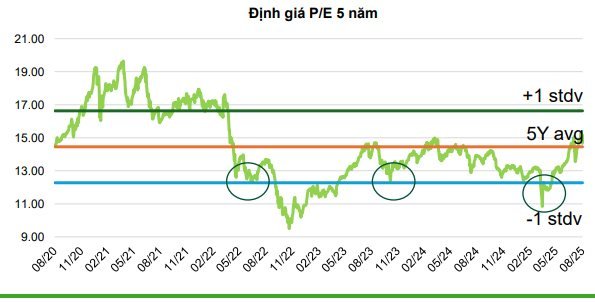 P/E hiện tại đang ở mức hấp dẫn so với bình quân khu vực (~15,3x) và bình quân 5 năm (~14,4x), đồng thời mặt bằng lãi suất thấp cùng tăng trưởng tín dụng tăng mạnh vào các tháng cuối năm, được kỳ vọng sẽ tiếp tục hỗ trợ thanh khoản thị trường dồi dào và nâng mặt bằng định giá P/E các ngành lên nền cao mới.