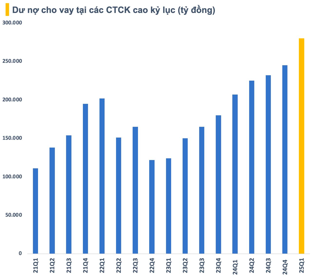 Theo thống kê, tính đến cuối quý 1/2025, dư nợ cho vay tại các công ty chứng khoán ước tính vào khoảng 280.000 tỷ đồng (~11 tỷ USD), tăng 35.000 tỷ so với cuối năm 2024 trước đó và là mức cao kỷ lục từ trước đến nay. Trong đó, dư nợ margin ước tính khoảng 273.000 tỷ đồng, tăng 33.000 tỷ so với cuối năm 2024 và cũng là con số cao nhất trong lịch sử chứng khoán Việt Nam.