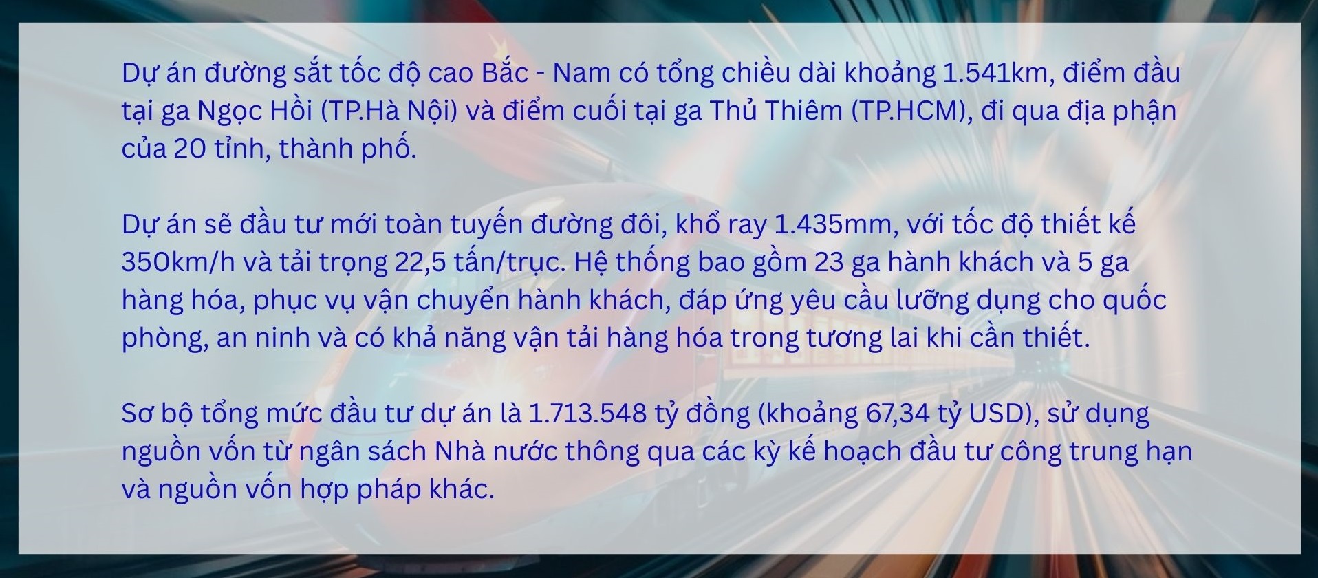 Tuyến đường sắt tốc độ cao Bắc - Nam bắt đầu tại TP.Hà Nội (ga Ngọc Hồi) và kết thúc tại TP.HCM (ga Thủ Thiêm) với chiều dài tuyến khoảng 1.541km, tốc độ thiết kế 350km/h, rút ngắn thời gian di chuyển từ Hà Nội - TP.HCM còn khoảng 5 giờ 30 phút.