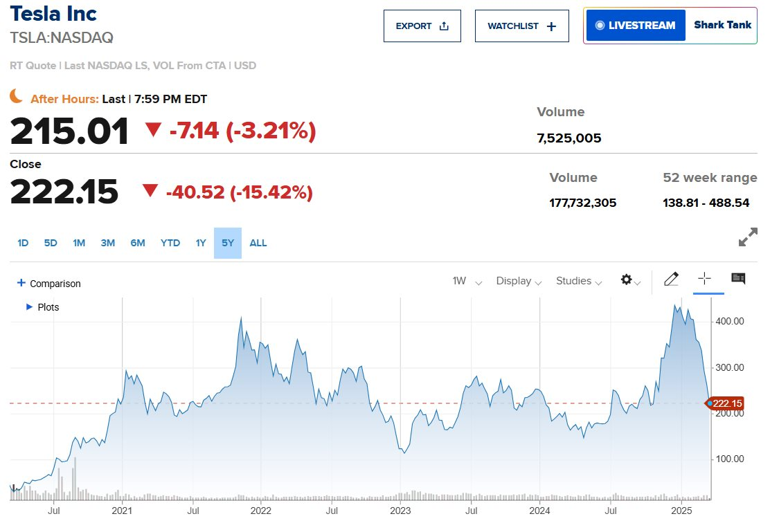 Tesla dẫn đầu đà giảm chung của chứng khoán Mỹ, kéo Nasdaq sụt gần 4% – mức giảm sâu nhất kể từ 2022. Áp lực lên cổ phiếu Tesla đến từ bất ổn quanh kế hoạch thuế quan của Tổng thống Donald Trump. Canada và Mexico là hai thị trường cung ứng ô tô lớn. Và hai quốc gia này có thể chịu tác động từ thuế tăng, dẫn đến nguy cơ đụng độ thương mại, ảnh hưởng sản xuất và đẩy giá xe tăng cao.