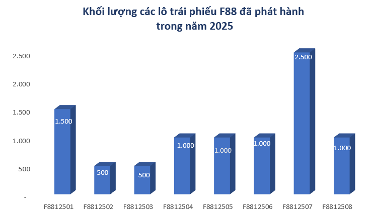 Tính từ đầu năm tới nay, F88 đã phát hành thành công tổng cộng 8 lô trái phiếu riêng lẻ, tổng giá trị thu về đạt 900 tỷ đồng.