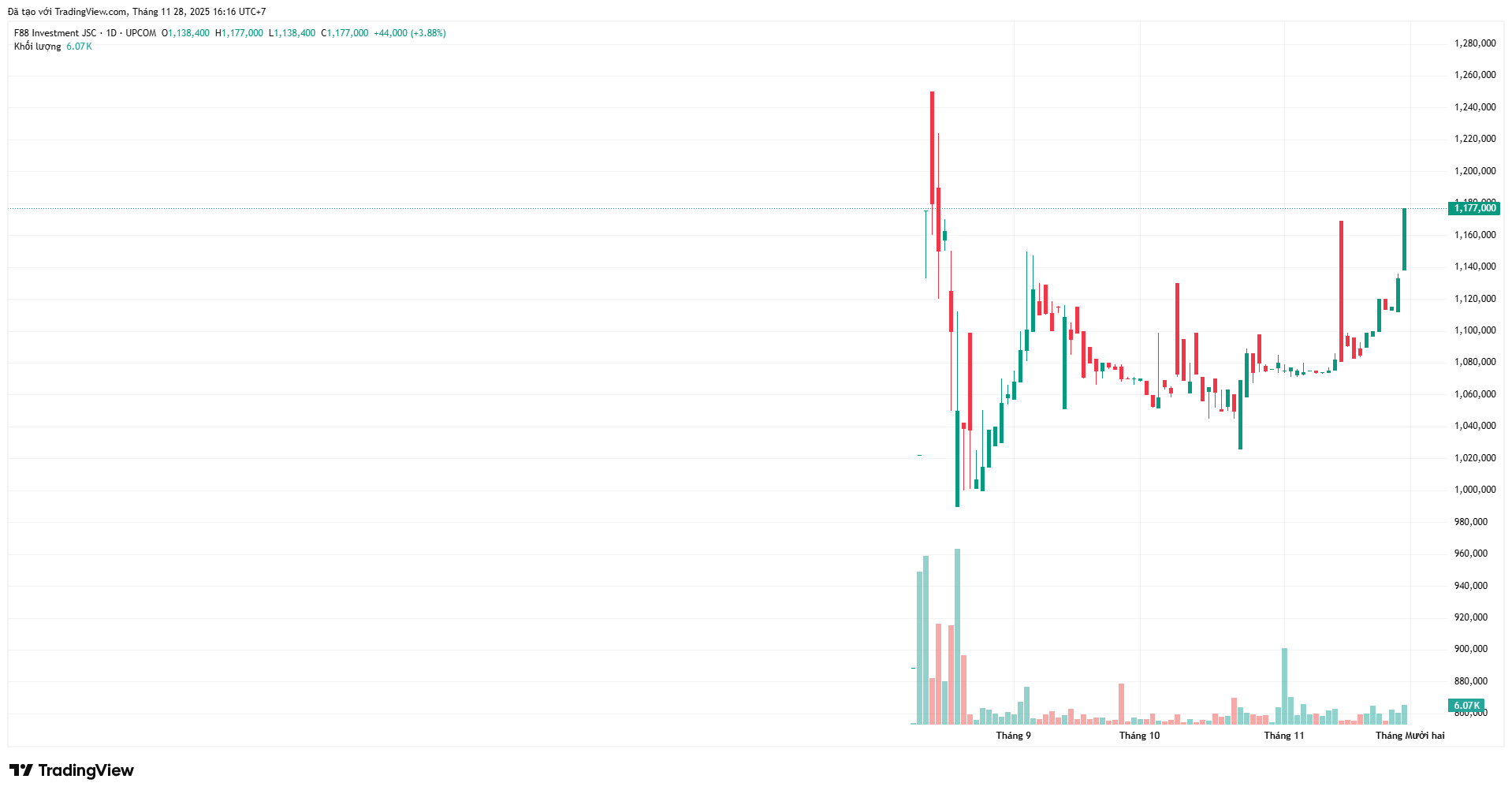 Kết thúc phiên giao dịch sáng ngày 28/11, giá cổ phiếu F88 ở mức 1.177.000 đồng/cổ phiếu, tăng gần 32,43 % so với giá khởi điểm lúc lên sàn chứng khoán ngày 8/8/2025. Hiện, giá cổ phiếu đang được niêm yết cao nhất sàn chứng khoán.