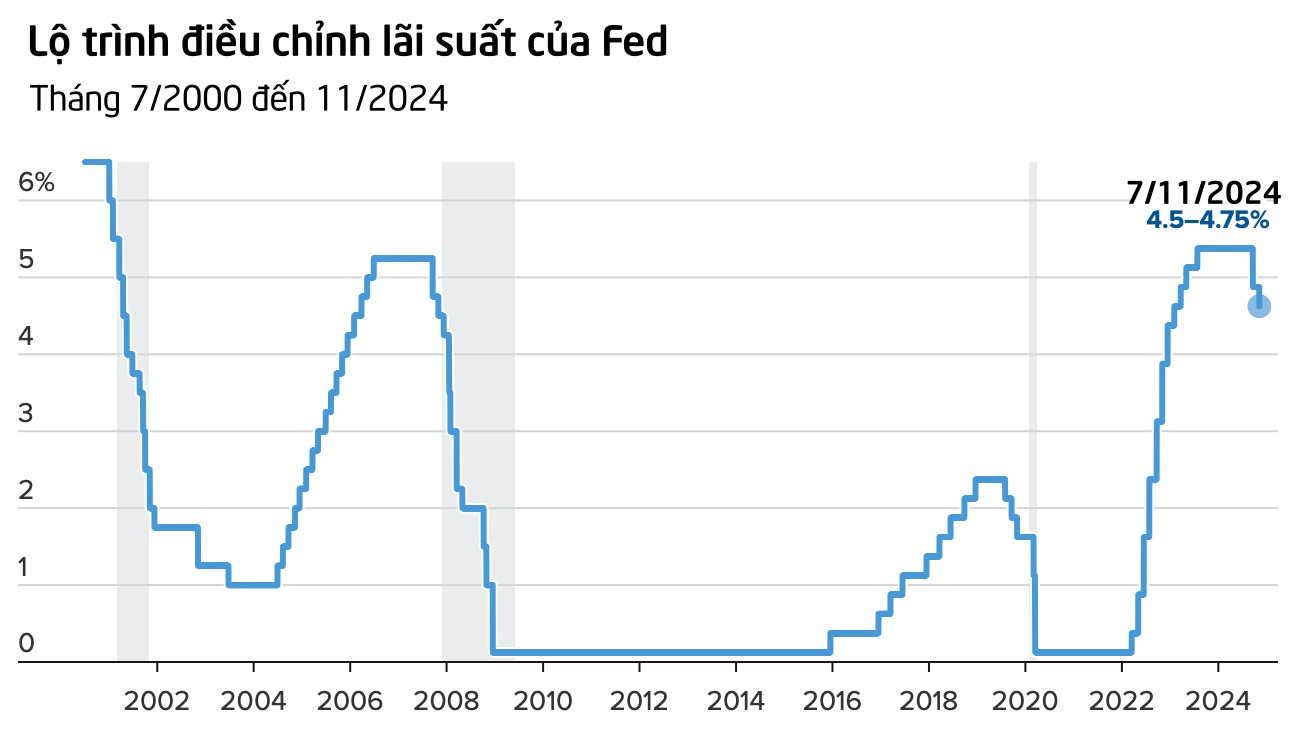 Sau mức cắt giảm 0,5% ở tháng 9, Uỷ ban Thị trường Mở Liên bang (FOMC) đã hạ lãi suất thêm 0,25%, xuống phạm vi 4,50% - 4,75%. Mức lãi suất này thiết lập mức phí mà các ngân hàng tính cho nhau khi cho vay qua đêm, nhưng thường ảnh hưởng đến các công cụ nợ tiêu dùng.