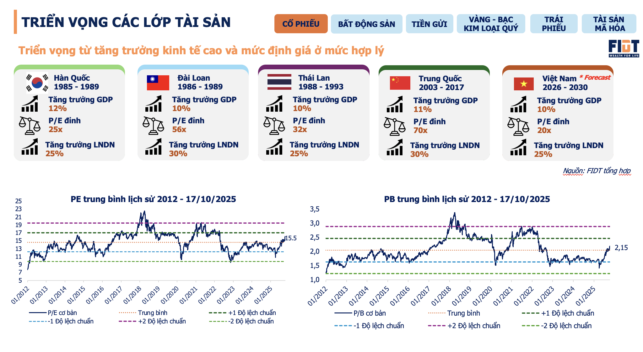 Với Việt Nam, FIDT dự báo giai đoạn 2026–2030 sẽ chứng kiến tăng trưởng GDP 10%, P/E đỉnh 20 lần và tăng trưởng lợi nhuận doanh nghiệp 25%, cho thấy định giá vẫn ở mức hợp lý so với tiềm năng tăng trưởng dài hạn.