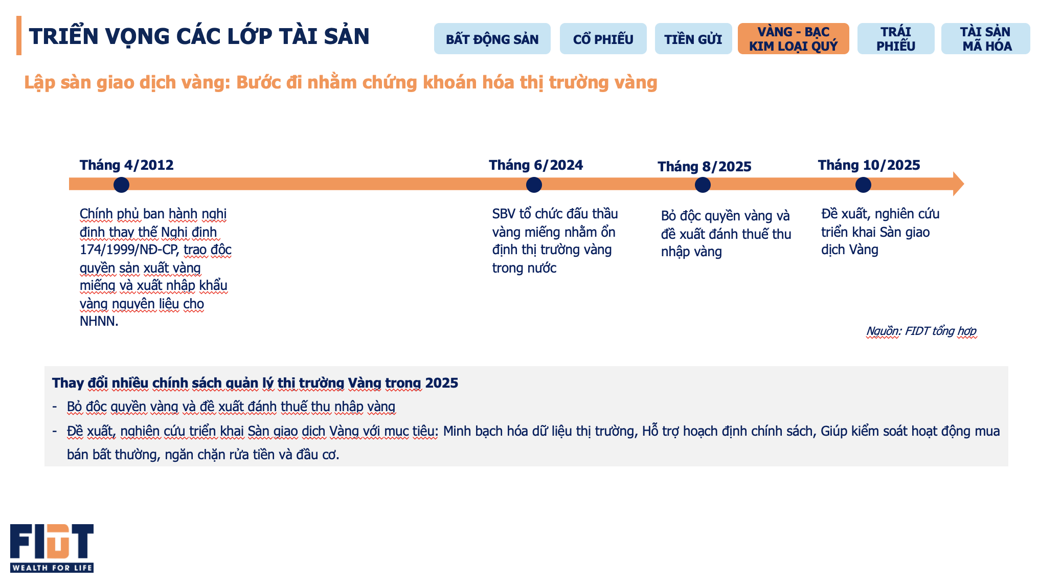 FIDT cho rằng xu hướng phân bổ tài sản sẽ dịch chuyển theo hướng đa kênh, tăng tỷ trọng đầu tư vào các lớp tài sản mới. Trong đó, cổ phiếu, trái phiếu, vàng, bạc được tăng tỷ trọng phân bổ và tài sản mã hóa trở thành kênh phân bổ mới, phản ánh xu hướng đầu tư hiện đại.