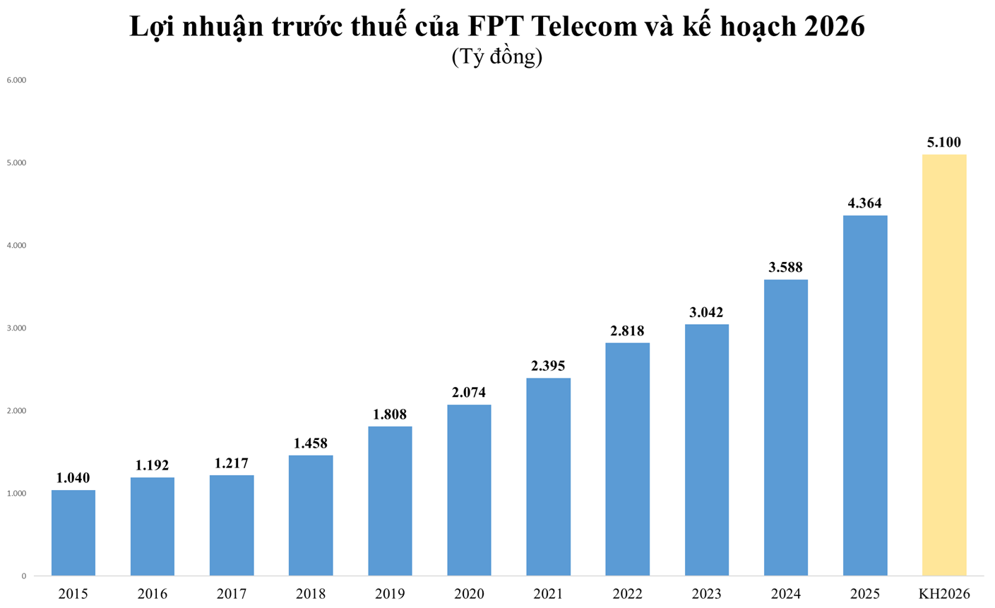 Năm ngoái, FPT Telecom ghi nhận doanh thu hơn 19.500 tỷ đồng và lợi nhuận sau thuế 3.486 tỷ đồng, tăng lần lượt 10,8% và 21,8% so với năm 2024.