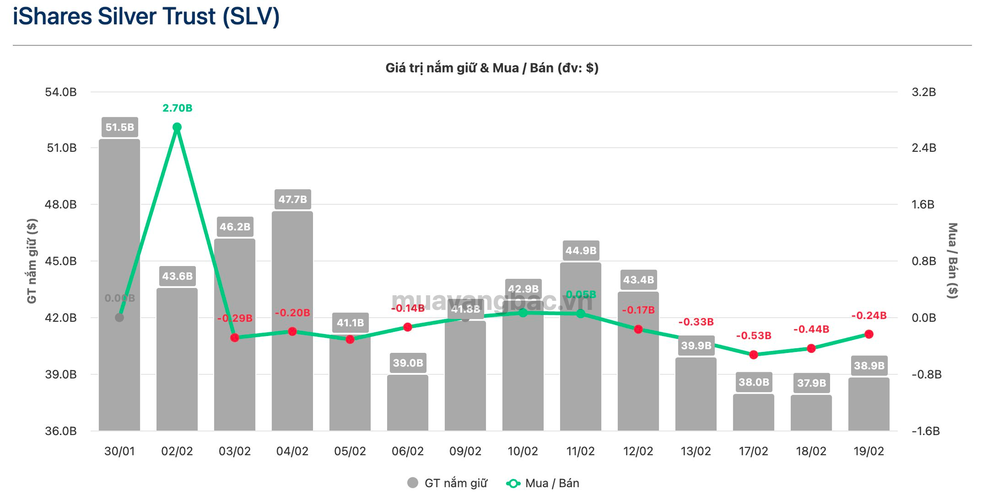 Theo dữ liệu cập nhật từ muavangbac.vn, iShare Silver Trust (SLV) do BlackRock quản lý tiếp tục bán ra 236 triệu USD (khoảng 97 tấn bạc) trong ngày 19/2. Đây là ngày thứ 5 liên tiếp quỹ bạc lớn nhất thế giới bán ra, với tổng khối lượng lên đến hơn 700 tấn. Tính đến ngày 19/2, SLV còn nắm 16.000 tấn bạc, tương ứng quy mô khoảng 38,9 tỷ USD.