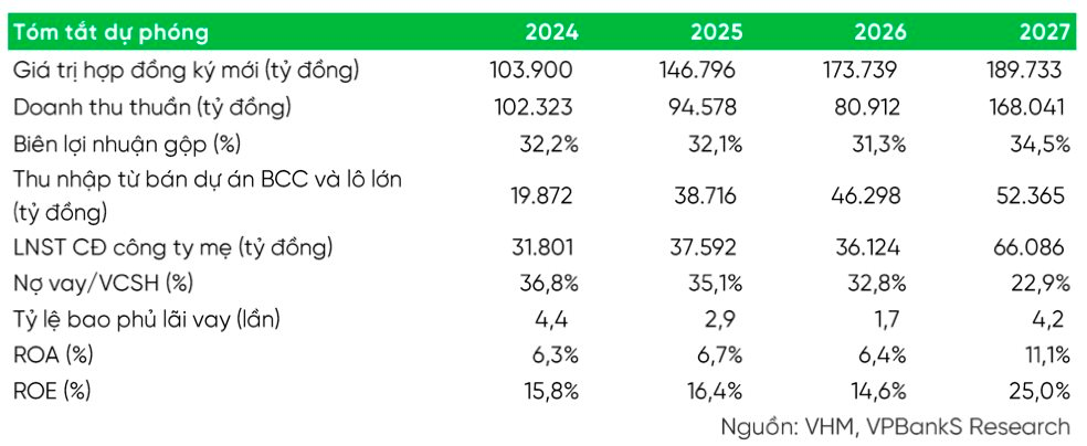 Năm 2025, VPBankS dự báo doanh thu VHM ước đạt 94.578 tỷ đồng, giảm 7,6% so với năm trước do thời điểm bàn giao các dự án mới chưa tới. Đặc biệt, đội ngũ phân tích dự báo VHM ghi nhận 38.716 tỷ đồng từ các thương vụ bán lô lớn trong năm 2025, chủ yếu tại Golden City, Green City và Green Paradise. Nhờ vậy, lợi nhuận sau thuế cổ đông công ty mẹ năm 2025 được kỳ vọng tăng 18,2%, đạt 37.592 tỷ đồng.