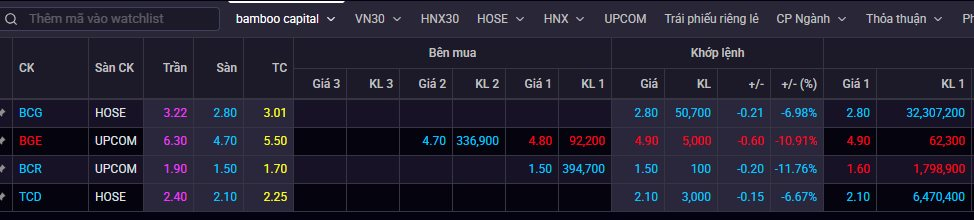 Ngoài ra, các mã BGE và BCR giao dịch trên sàn UPCoM cũng trong sắc thái “xanh lơ”. Thị giá đồng loạt giảm về vùng đáy lịch sử.