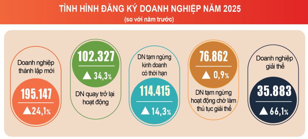 Cũng trong năm 2025, cả nước có 102,3 nghìn doanh nghiệp quay trở lại hoạt động (tăng 34,3% so với năm 2024), nâng tổng số doanh nghiệp thành lập mới và quay trở lại hoạt động trong năm 2025 lên 297,5 nghìn doanh nghiệp, tăng 27,4% so với năm 2024. Bình quân một tháng có 24,8 nghìn doanh nghiệp thành lập mới và quay trở lại hoạt động.