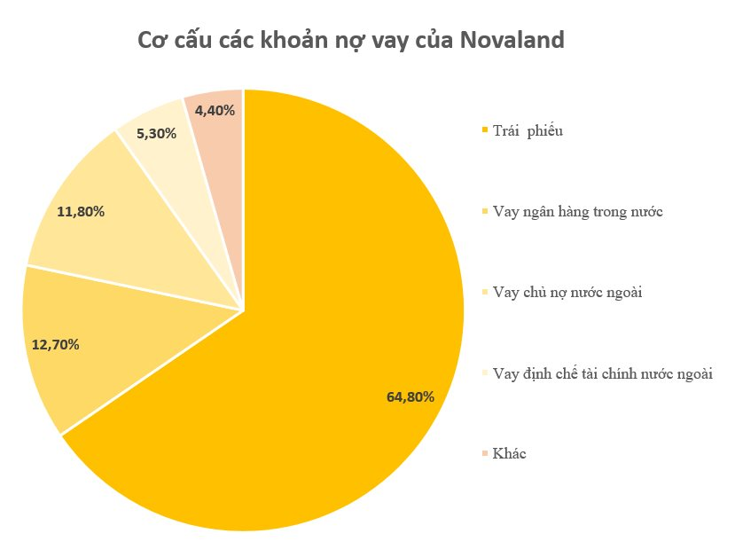 Lớn nhất trong các khoản nợ của Novaland là trái phiếu doanh nghiệp với 38.396 tỷ đồng, chiếm gần 65% tổng dư nợ. Ngoài ra, doanh nghiệp này còn vay hơn 7.500 tỷ từ các ngân hàng trong nước và hơn 7.000 tỷ vay các chủ nợ nước ngoài.