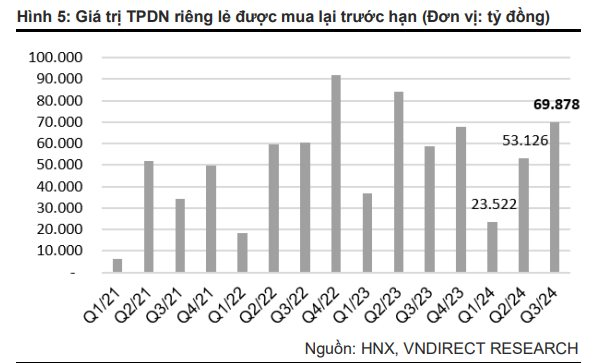 Về hoạt động mua lại trái phiếu trước hạn cũng tiếp tục gia tăng. Tổng giá trị trái phiếu doanh nghiệp riêng lẻ được mua lại trước hạn trong Q3/24 đạt gần 70 nghìn tỷ đồng, tăng 31,5% so với Q2/24, và tăng 19% svck. Lũy kế 9 tháng đầu năm, tổng giá trị TPDN được mua lại trước hạn đạt hơn 146,5 nghìn tỷ đồng, giảm 18,5% svck.