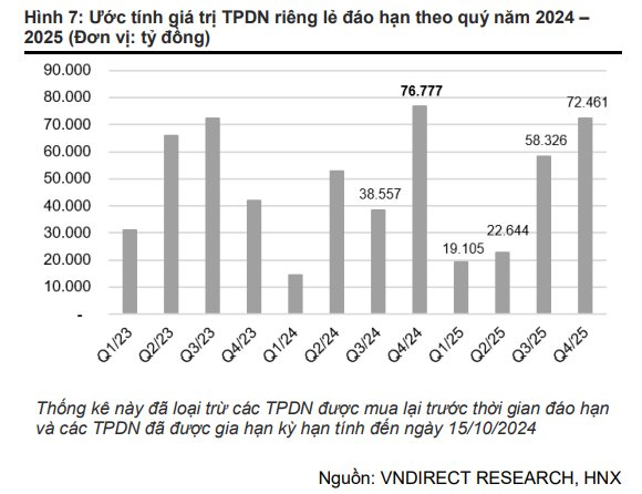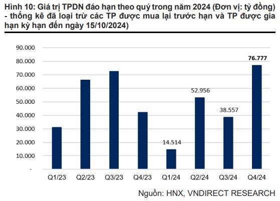 Đánh giá về triển vọng thị trường TPDN quý 4/2024, VNDirect cho rằng sau khi hạ nhiệt nhẹ trong Q3/24 áp lực đáo hạn sẽ tăng mạnh trở lại trong Q4/24. VNDirect ước tính, trong Q4/24 sẽ có khoảng gần 77 nghìn tỷ đồng TPDN riêng lẻ đáo hạn, tăng 99,1% so với Q3/24.