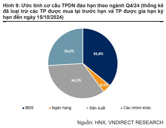 Bên cạnh đó, danh sách các công ty chậm thanh toán nợ TPDN vẫn gia tăng. Tính đến ngày 15/10/2024, có khoảng hơn 80 DN nằm trong danh sách chậm nghĩa vụ thanh toán lãi hoặc nợ gốc TPDN theo thông báo của HNX. VNDirect ước tính, tổng dư nợ TPDN riêng lẻ của hơn 80 DN này là khoảng 190 nghìn tỷ đồng, chiếm khoảng 18,6% dư nợ TPDN riêng lẻ toàn thị trường. Phần lớn trong số các TCPH này là các doanh nghiệp thuộc nhóm BĐS.