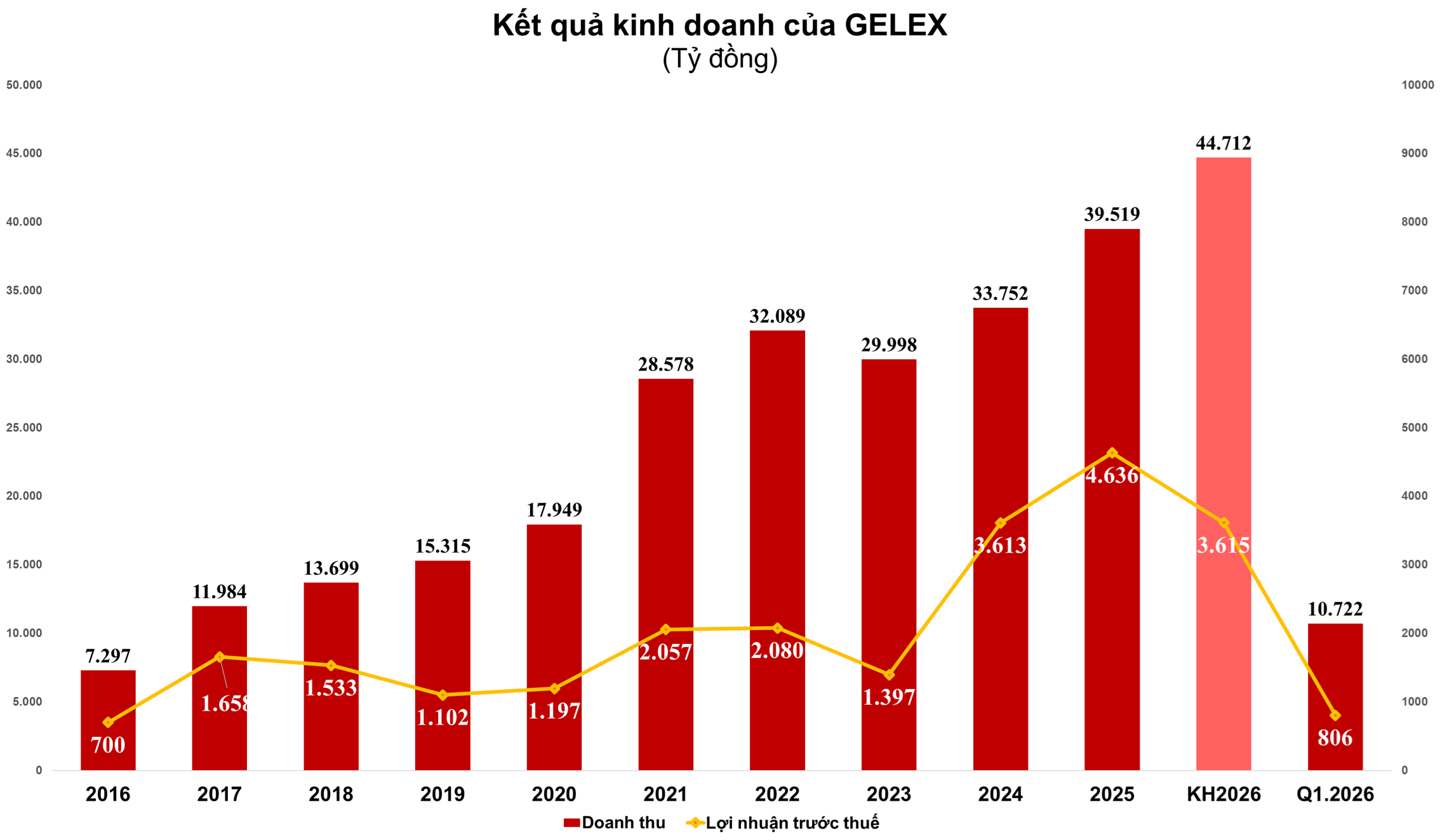 Năm 2026, Gelex đạt mục tiêu đạt doanh thu thuần hợp nhất 44.712 tỷ đồng và lợi nhuận trước thuế 3.615 tỷ đồng. Như vậy, hết quý I, công ty đã thực hiện khoảng 24% kế hoạch doanh thu và 22% chỉ tiêu lợi nhuận trước thuế cả năm đề ra.